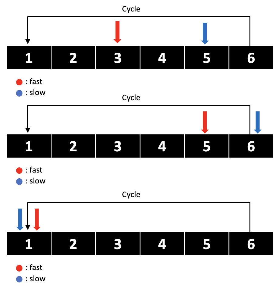 - 순환이 있는 경우 : fast는 slow보다 먼저 끝에 도달하게 된다. (fast가 먼저 null이 된다.)