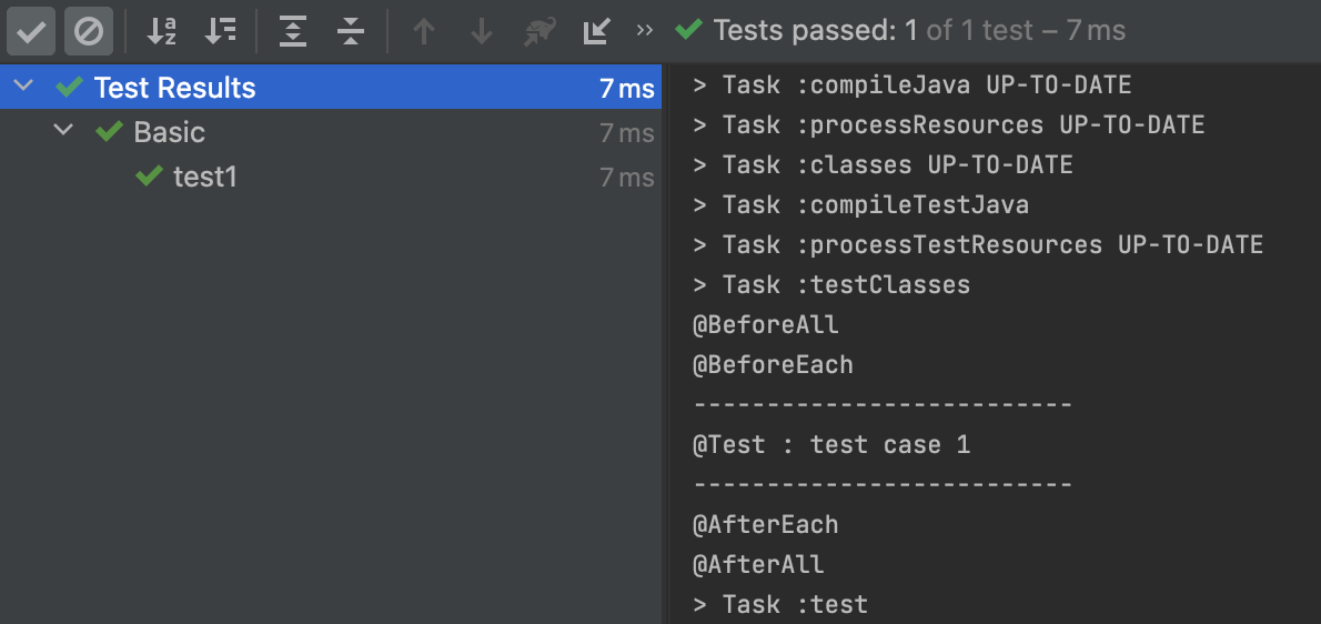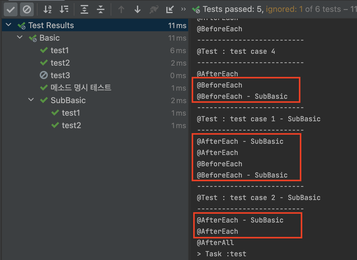 위와 같이 Nested 클래스의 테스트 메소드는 전, 후로 SubBasic이 붙은 Each 메소드가 더 실행되는 것을 볼 수 있습니다.