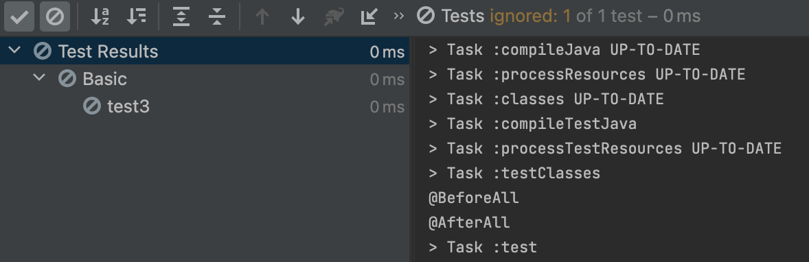 "test3" 메소드는 @Disable 메소드로 테스트 로직을 실행하지 않습니다. 하지만 @BeforeAll 메소드와 @AfterAll 메소드는 실행되는 것을 볼 수 있습니다.