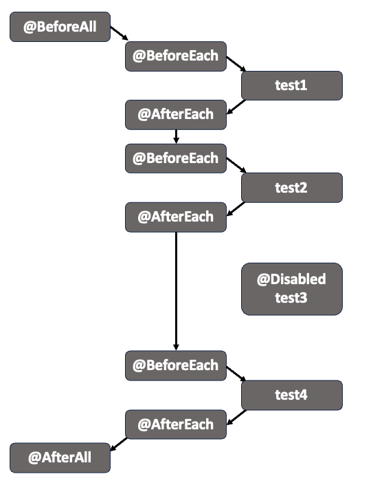하지만 사전 메소드인 @BeforeAll, @AfterAll은 실행되고, @BeforeEach, @AfterEach는 실행되지 않는 특징이 있습니다.
