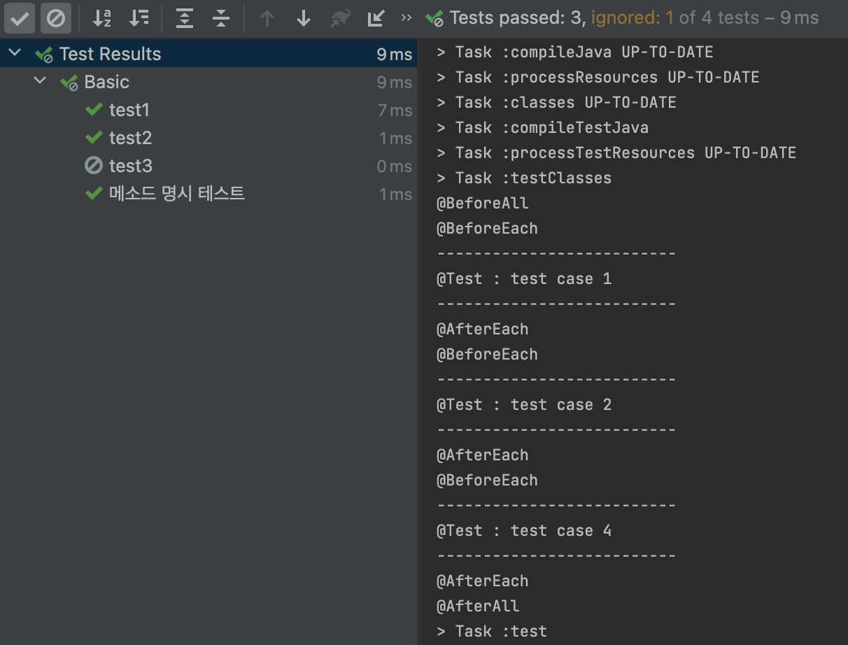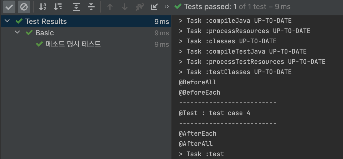 "test4" 메소드는 @DisplayName을 이용해 메소드 이름을 명시했습니다. 그래서 왼쪽 테스트 결과창에서 "메소드 명시 테스트" 라고 나오는 것을 볼 수 있습니다.