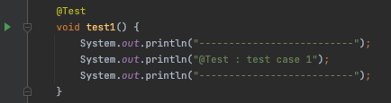 본 어노테이션은 테스트 메소드를 명시하는 어노테이션입니다. 테스트를 위해서는 필수로 작성되어야 하는 어노테이션으로 볼 수 있습니다. Intellij에서 사용하게 되면 @Test 어노테이션을 명시한 메서드 옆에 아래와 같이 실행 버튼이 생성됩니다. 해당 버튼을 누르면 메서드 별로 테스트를 실행할 수 있습니다.