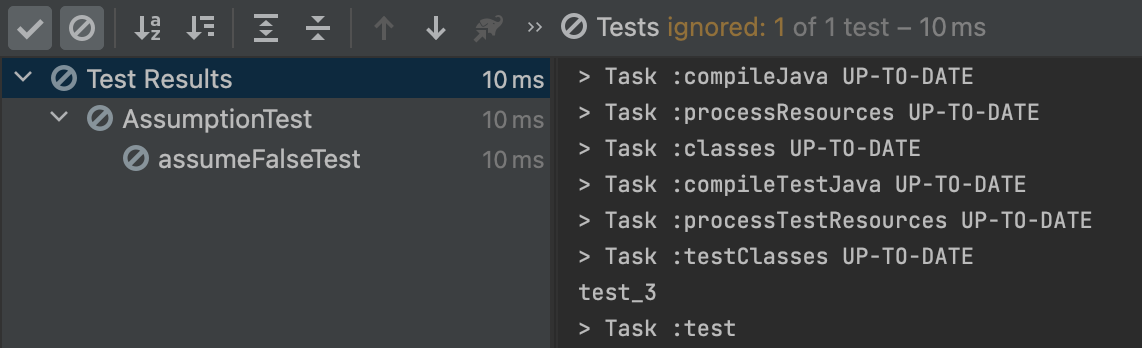 첫 번째 assumeFalse는 False이기 때문에 통과하고 "test_3"이 출력되지만, 두 번째 assumeFalse는 True이기 때문에 통과하지 못하고 테스트가 멈춘 것을 확인할 수 있습니다.