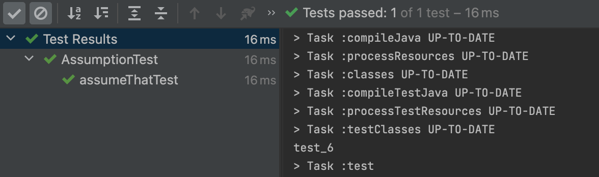 첫 번째 assumeTrue는 True이기 때문에 통과하고 "test_1"이 출력되지만, 두 번째 assumeTrue는 False이기 때문에 통과하지 못하고 테스트가 멈춘 것을 확인할 수 있습니다.