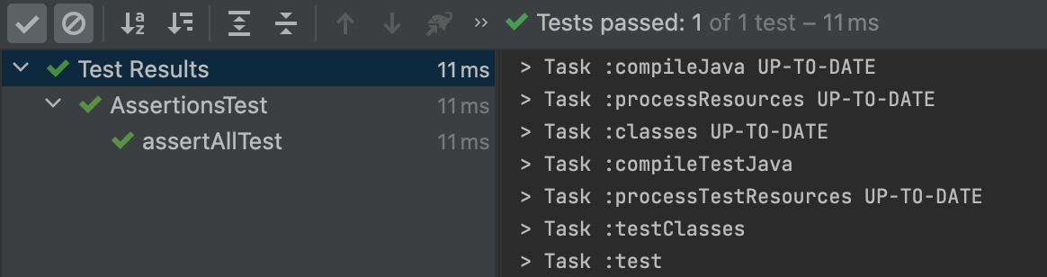 여러 개의 AssertTrue문이 하나의 assertAll문 안에서 동작되는 것을 확인할 수 있습니다.