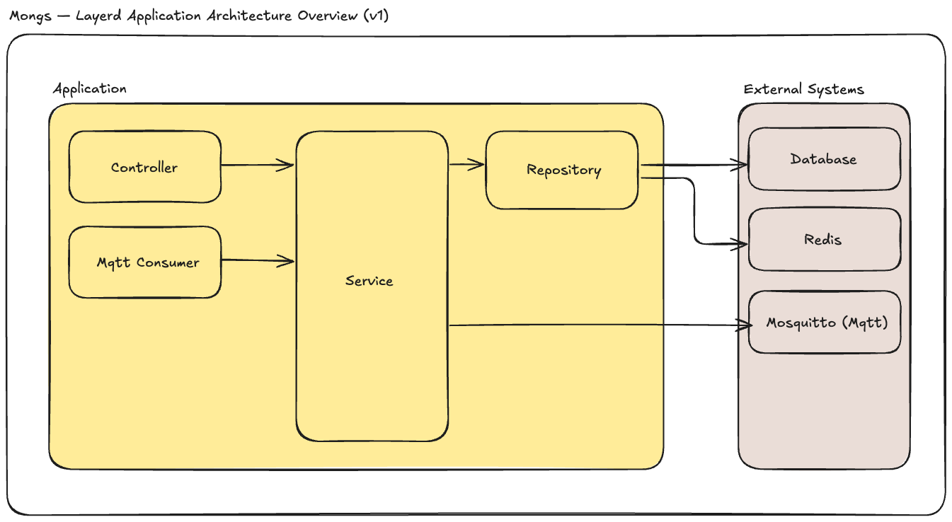 서비스 구조는 전통적인 레이어드 아키텍처를 기반으로 Controller, Service, Repository 세 계층으로 나누고 외부 이벤트 처리를 위해 Mqtt Consumer를 추가했다.